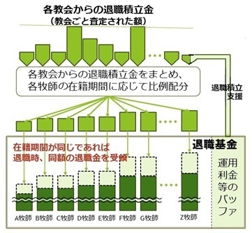 毎年度、各教会から納入いただいた「退職積立金」を一旦まとめ、それを各教師の在職期間に従って比例配分し、各教師の退職金として積み立てます。したがって、在職期間が同じであれば、支給される退職金は同じとなります。